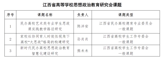 近日,江西省教育厅公布了2024年江西省高等学校思想政治教育研究会课题评审结果,必赢官网教师陈洋安申报的《民办高校艺术类专业学生思政课实践教学路径研究》获江西省民办高校德育专业委员会一般课题立项,孙肖肖老师申报的《家校社协同育人时效性视角下高校“大思政”格局的构建研究》获得江西省高校学生工作专委会一般课题立项,熊未未老师申报的《新时代民办高校思想政治教育智慧化建设研究》获江西省高校学生工作专委会一般课题立项。