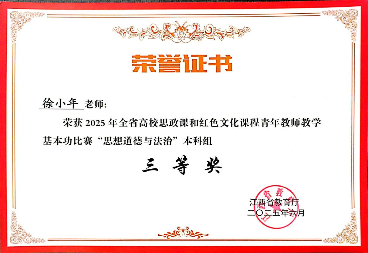 (必赢国际437官网 讯)近日,江西省教育厅正式公布2025年全省高校思政课和红色文化课程青年教师教学基本功比赛结果,在这场汇聚全省高校教学精英的激烈角逐中,必赢官网思政课教师徐小年凭借扎实的专业素养与创新的教学风采斩获《思想道德与法治》课程(本科组)三等奖。 据悉本次全省高校思政课和红色文化课程青年教师教学基本功决赛,设置一等奖10%、二等奖15%、三等奖20%,竞争激烈。学院精心准备,参赛选手敢于挑战,克服困难,以赛促教,最终获得奖项。 此次获奖将激励必赢官网继续深化思政课改革创新,进一步加强青年教师培养,推动思政课建设再上新台阶,为培养德智体美劳全面发展的社会主义建设者和接班人提供坚强保障。