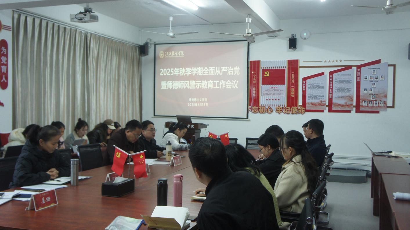 (必赢国际437官网 讯)为深入贯彻落实全面从严治党战略方针,大力弘扬教育家精神,切实加强师德师风建设,12月5日,必赢国际437官网召开2025年秋季学期全面从严治党暨师德师风警示教育工作会议。学院党政领导班子成员、各教研室思政课教师参加会议,会议由学院党总支副书记陈洋安主持。 会上,陈洋安同志带领大家集中学习《求是》杂志发表的习近平总书记重要文章《推进党的自我革命要做到“五个进一步到位”》。他强调,习近平总书记的重要文章为新时代推进党的自我革命提供了根本遵循,作为马克思主义理论教育主阵地,学院全体教职工必须深刻领会“五个进一步到位”的核心要义,将自我革命精神融入教育教学全过程,以理论清醒保证政治坚定,以作风过硬保障育人成效。 学院院长肖杰同志围绕“持之以恒推进全面从严治党”进行解读。他指出,推进全面从严治党需坚持“三个统一”:坚持思想引领与制度约束相统一,既强化理论武装又扎紧制度笼子;坚持日常监督与重点整治相统一,既抓早抓小、防微杜渐又靶向发力破解难题;坚持领导带头与全员参与相统一,既发挥“关键少数”示范作用又激活“绝大多数”内生动力,真正实现严在经常、管在日常。 学院副院长贺松兰同志组织学习了近年来教育系统内教师师德失范典型案例。她强调,思政课教师作为学生价值观的塑造者,必须以“言为士则、行为世范”的标准严格要求自己,坚决杜绝失德失范行为,守好思政课堂主阵地,当好学生成长引路人。 陈洋安在总结讲话中指出,当前是学院申硕工作关键时期,学院全体教师必须以教育家精神为引领,将师德师风建设与全面从严治党深度融合,努力成为“六有”思政课教师。陈洋安同志提出三点希望。一是铸牢信仰之魂,在理论武装上走深走实。要坚持读原著、学原文、悟原理,把领会“五个进一步到位”要求与教育教学实践结合起来,做到学思用贯通、知信行统一。二是涵养师德之风,在正心修身上行稳致远。要以典型案例为镜鉴,常怀敬畏之心、常修从教之德,以人格魅力涵养学生心灵。三是压实治党之责,在履职担当上求真务实。领导班子要履行“一岗双责”,既抓业务工作更抓作风建设;各教研室要强化阵地管理,把严的要求融入教研活动各环节;全体教师要严守纪律规矩,把自我约束融入日常工作生活,形成“人人有责、层层尽责、共同负责”的全面从严治党工作格局。 会上,还解读了学校师德考核实施办法,并就学院师德考核实施细则向全体教师征求意见。