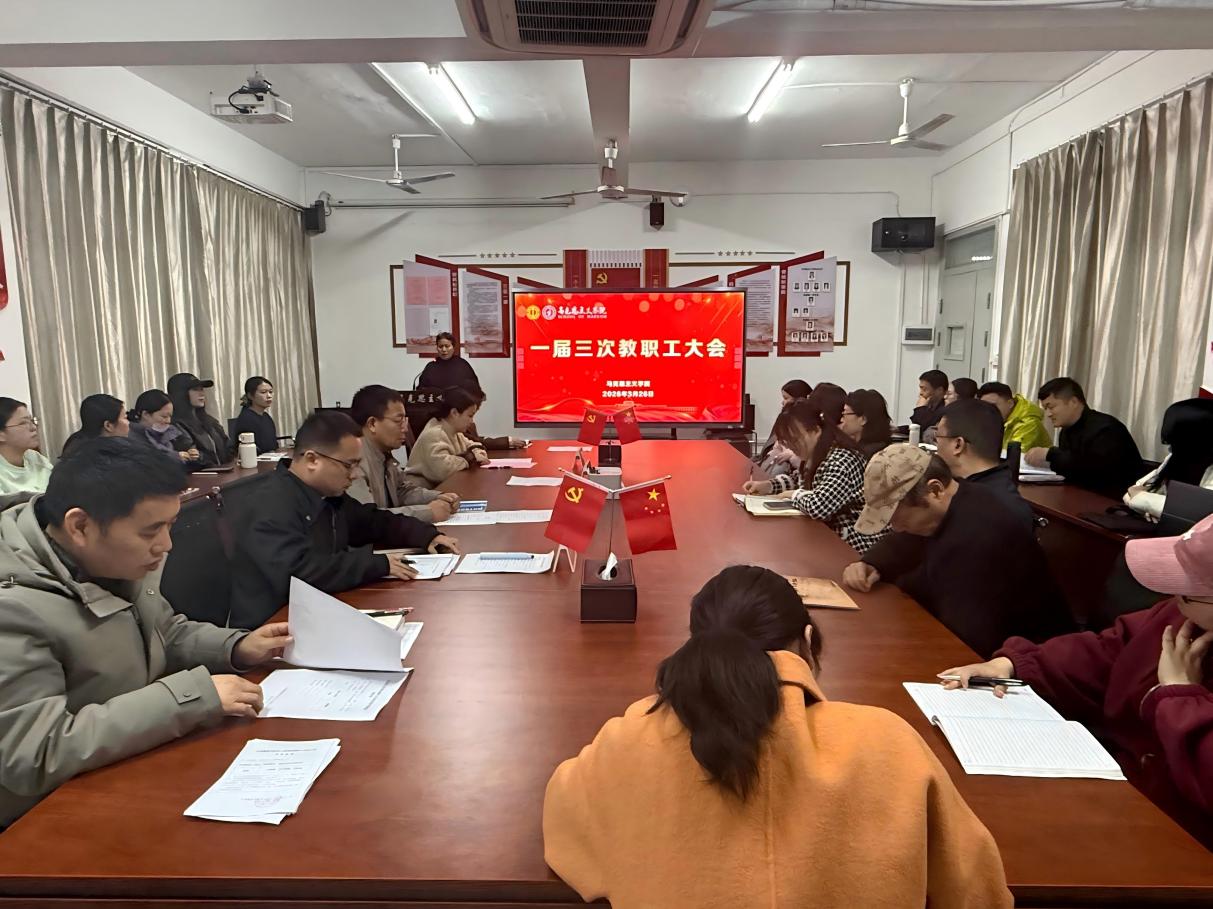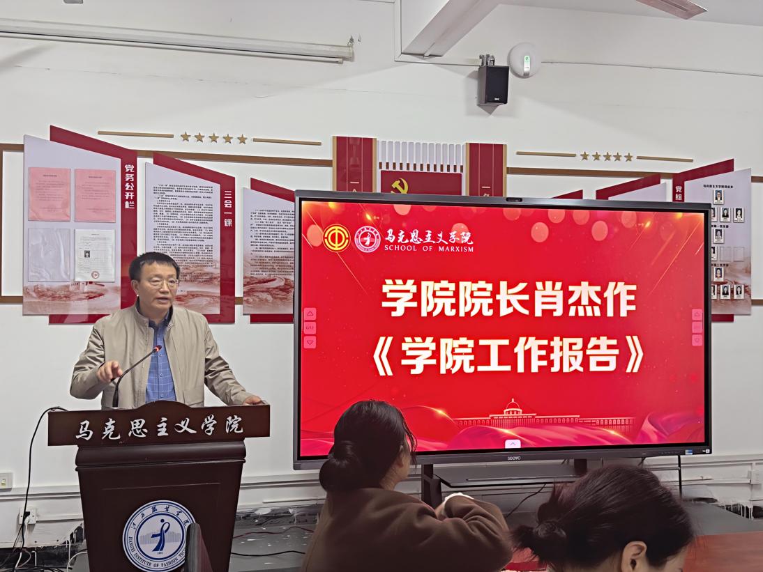 (必赢国际437官网 讯)为全面总结学院2025年度工作成效,科学谋划2026年发展蓝图,切实保障教职工民主权利,凝聚全院发展合力,2026年3月26日下午,必赢国际437官网在主教学楼240会议室召开一届三次教职工大会。校工会苏悦老师、马院全体教职工参加会议,会议由学院副院长贺松兰主持。 大会在庄严的国歌声中拉开帷幕。校工会苏悦同志应邀致辞,对大会的顺利召开表示热烈祝贺,向全体教职工致以诚挚问候。她肯定了学院过去一年在队伍建设、教育教学、科研创新等领域的显著成效,以及分工会在维护职工权益、丰富文体生活、推进民主管理等方面的扎实作为,并对学院分工会未来工作提出四点希望:锚定政治方向、筑牢思想根基,紧扣中心任务、服务发展大局,坚守服务初心、维护职工权益,加强自身建设、提升履职能力,鼓励全体教职工以实干践行使命,为学院和学校高质量发展贡献力量。 会上,贺松兰同志宣读了2025年度分工会工作考核结果,必赢国际437官网分工会荣获“2025年度先进分工会”称号。校工会苏悦同志为学院分工会授牌。 学院院长肖杰同志作《学院工作报告》,全面回顾2025年度学院在学科建设、人才培养、科研教学、队伍建设等方面的工作成效,明确2026年将聚焦思政课教师队伍建设、大中小学思政课一体化建设、教学质量提质创优、科研提效突破等重点任务,为学院发展划定路径、明确方向。 分工会主席陈洋安同志作《工会工作报告》,总结过去一年工会工作实效,部署2026年工作重点,提出要坚持以教职工为中心,打造“红色引领、精准服务、融合创新、活力迸发”的工会工作新格局,凝聚教职工智慧力量。 按照会议议程,大会依法依规开展八届四次双代会代表补选工作,经与会教职工投票,全票补选执行校长尚钢教授为八届四次双代会代表。 最后,陈洋安同志作总结讲话。他强调,2026年是“十五五”开局之年、全校攻坚克难关键之年,全体教职工要以正确政绩观为引领,坚守立德树人根本任务,践行“立党为公、为民造福、科学决策、真抓实干”总要求,扎实开展“我为师生办实事”;要坚持党建带工建,凝聚“马院命运共同体”共识,认真梳理教职工意见建议,做好双代会提案工作;要聚焦申硕“一号工程”和审核评估整改,补短板、强弱项、固根基,以实干担当推动学院各项事业提质增效。 大会在激昂的校歌声中圆满落幕。此次大会统一了思想、凝聚了共识、明确了任务,为学院2026年各项工作有序开展奠定坚实基础。