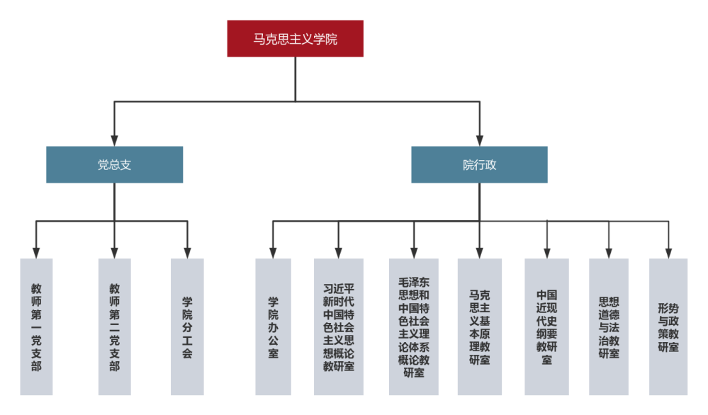 马克思主义学院机构设置是:党总支组织机构+学院教学机构+行政办公室。