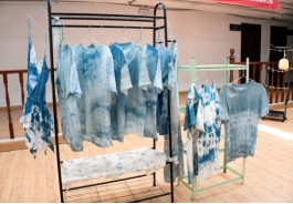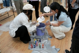 在扎染环节,主持人一边耐心细致地介绍扎染工艺的历史渊源和文化内涵,一边亲自示范如何使用玻璃珠、图案、棒签、橡皮筋等工具在T恤上创造出不同的图案。待示范结束,老师们充分发挥想象力,将白色T恤折叠、捆扎,有的扎出精巧的花朵图案,有的设计出独特的几何形状。随后,设计好的T恤放置在清水中浸泡15~20分钟,再放入染料桶内浸泡染色,经过氧化清洗后,一件件色彩斑斓、独一无二的DIY扎染T恤新鲜出炉。