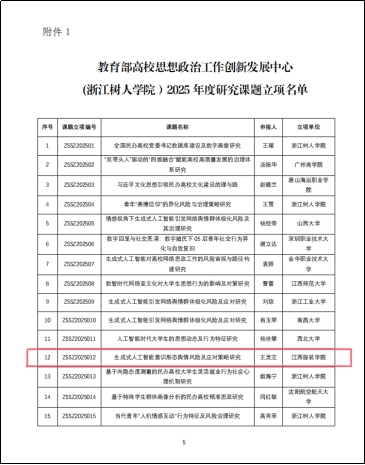 近日,教育部高校思想政治工作创新发展中心(浙江树人学院)公布了2025年度教育部高校思想政治工作创新发展中心(浙江树人学院)研究课题立项和预立项名单,由必赢官网思政课教师王灵芝教授主持的《生成式人工智能意识形态舆情风险及应对策略研究》课题获研究课题立项。
