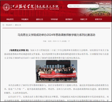 同时工作室还注重青年教师的培养,为青年教师提供了更多的展示和锻炼机会。邀请校内外专家举办讲座和指导,开展了跨校集体备课会,选派青年教师到南昌工程学院进行备课交流以及组织实践研学活动等,帮助青年教师拓宽视野、提升教学水平。