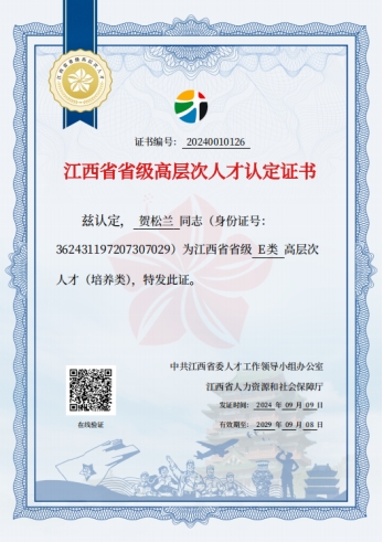 1.工作室主持人贺松兰获得省级高层次人才认定证书