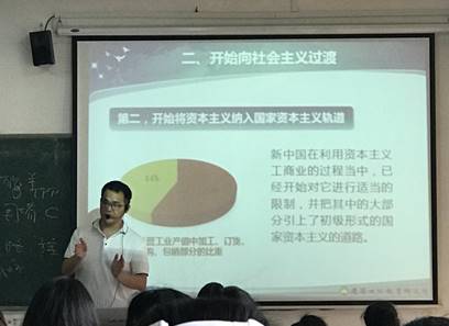 朱忠文老师在此次磨课中主要是围绕第八章社会主义基本制度在中国的确立这一教学内容,朱老师做了充分的准备,首先对上节课的内容进行了回顾,对本节课的主要教学内容等方面进行了介绍。朱老师的课件制作精美,有效将相关数据和组织框架图进行结合,使学生能够很好的理解相关知识点。朱老师理论知识扎实,在课程讲解的过程中引经据典帮助学生理解相关知识点,语言表达规范,重难点突出,展现了较强的教学素养和扎实的学术功底。在讲课过程中学生能够积极参与到课堂教学中,课堂氛围活跃。